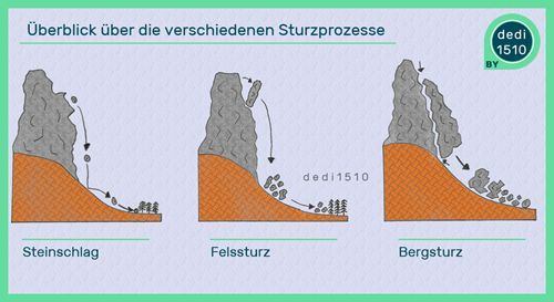 Diese Ereignisse entstehen oft durch Verwitterung, besonders entlang von Trennflächen. Die Sturzbahn wird von Baumbestand und Untergrund beeinflusst, wobei die Komponenten häufig bei Hangneigungen von weniger als 30° zum Stillstand kommen. Wälder haben eine dämpfende Wirkung, da sie die fallenden Gesteinskörper verlangsamen oder stoppen können.