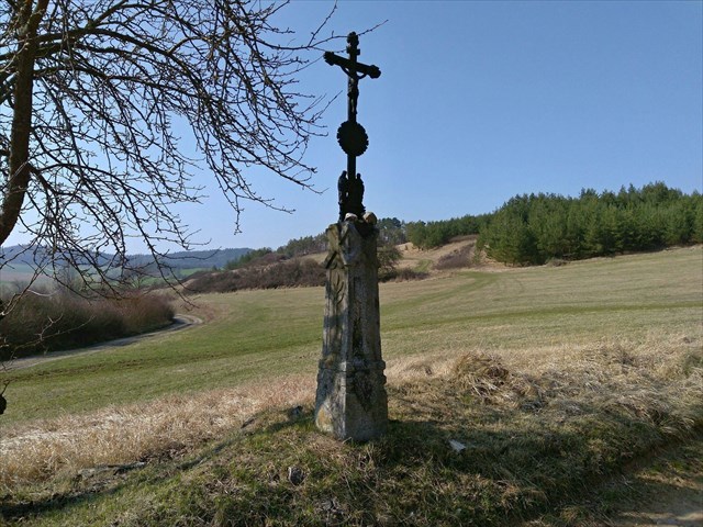 Kříž, křížek, krucifix je nejčastější drobnou památkou v krajině. Historie symbolu je již předkřesťanská. Jsou z různých materiálů, například dřevěné, kamenné, litinové atd. Jsou krásné a obdivuhodné. Vzbuzují úctu, navozují pokoru. Mohou být orientačním bodem, ale také připomínkou významných událostí. Někdy lze tuto událost dohledat díky nápisu na kříži, jindy se to nepodaří. U křížků lidé často zasazovali stromy, nejčastěji lípy. Křížky se bohužel nezřídka stávají terčem zlodějů či vandalů. Mnoho křížů je stále s láskou udržovaných. Je ale také mnoho zapomenutých, ukrytých v keřích nebo kopřivách. I ty ale mají šanci stát se opečovávanými, stačí jim k tomu pomoci. Někdy stačí málo, třeba vysekávat kopřivy a udržovat okolí. Jindy je zapotřebí víc, například opravit podstavec nebo samotný křížek. Věnujme křížkům trochu pozornosti, ať se nám tito svědci minulosti zachovají i do budoucna. Tato zastávka je věnována křížku u polní cesty u města Rabí. Vede kolem něj žlutě značená turistická trasa. Díváme-li se směrem k Rabí, tak po levé straně je vrch Šibeník, vpravo vrchol Lišná.