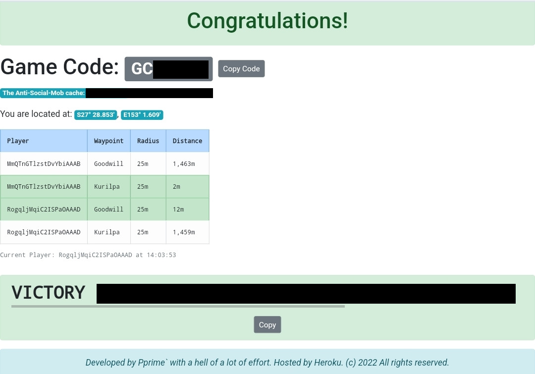 As soon as all target waypoints are occupied, the screen will display (for those that are occupying a target waypoint at the time) secret reward information - in this case final coordinates of the geocache container. A button is provided to copy that information to your smartphone's memory so you can paste it into another location (for example the final GZ space or personal notes space of your favourite Geocaching application).