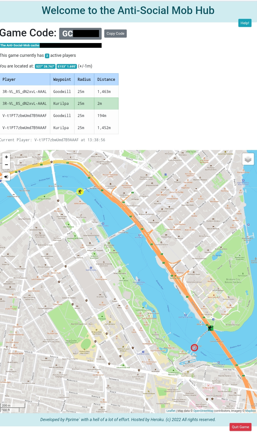 The game screen will display with information about how many players are active in the game currently, where you and they are, and how close each player is to each target waypoint. Each player will be given a unique Player code for this game session, and you can see your code directly underneath the table and above the map display.