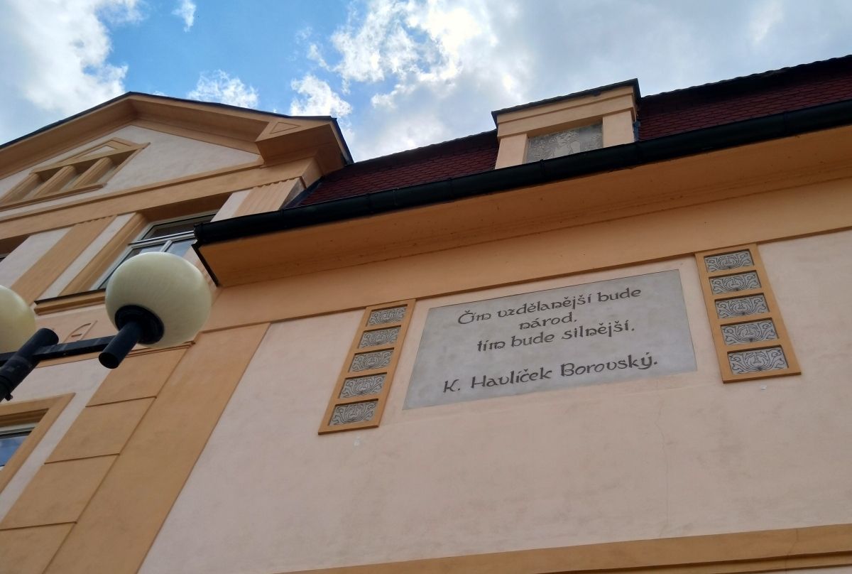 Sejdeme se pod okny bývalé obecné a občanské školy v Ledenicích. Původní budova byla z kapacitních důvodů několikrát rozšiřována, až v roce 1887 proběhla přístavba prvního patra. Během roku 1925 přibylo ještě další poschodí a celý objekt získal také novou pohlednou fasádu, na níž vyniká tento nápis: