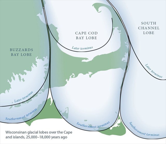 One other topic that is worth mentioning has to do with the shape of the island. Looking on a map of Marthas Vineyard, you may have been curious about the islands unique shape. Approximately 10,000 years ago during the Wisconsinan glaciation, multiple glacial lobes (which are extensions/protrusions of large ice sheet) advanced into the northeastern United States, significantly shaping the landscape. Specifically, the Buzzards Bay Lobe and the Cape Cod Bay Lobe played a crucial role in forming Martha's Vineyard. The Buzzards Bay Lobe, moving southward, deposited large amounts of glacial till, which formed the island's western moraines and outwash plains. Simultaneously, the Cape Cod Bay Lobe advanced from the northeast, contributing additional sediment and shaping the eastern part of the island. The interaction of these two lobes resulted in the distinctive geological features and irregular coastline of Martha's Vineyard, as seen by the image above.