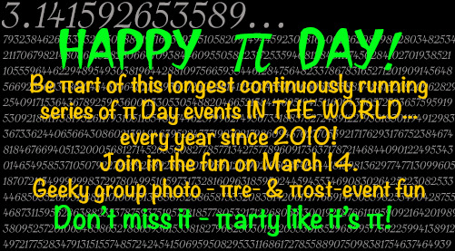 March 14. The date when it's extra cool to be a geek. The date when irrationality is a most respected quality. The date when friends gather together for no other reason but to celebrate their most favorite transcendental number. Pi Day is celebrated all over the world on 3/14, and students in some classes at the many schools, like the one in PA where this event's CO previously taught for many years, honor Pi in various ways on March 14. Come and meet for a morning beverage and perhaps food at Sunshine House Coffee. We'll be sure to get as many of you as possible together for the geekiest event photo you could imagine.