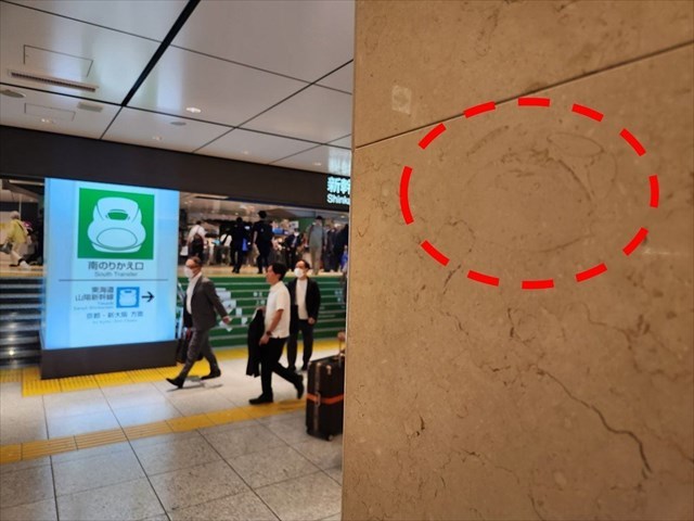 東京駅改札内の「東北・山形・秋田・北海道・上越・北陸新幹線 南のりかえ口」を出て、8段の階段を下りたあたりの柱の石材の中に、カニ化石があります。