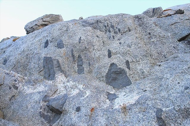 Mafic (dark) enclaves show that they have the same compositional characteristics as the plutonic bodies in which they occur, but were not formed at the same time and place beneath the Earth's surface.
