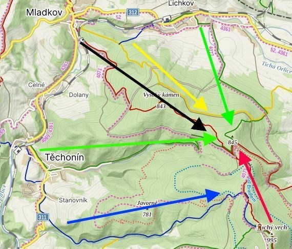 - červená Mladkov - z náměstí či nádraží v Mladkově po červené turistické značce (Jiráskova cesta a směr NS Betonová hranice) kolem Radioaktivních pramenů na kótu Vysoký kámen a následně již prakticky po rovině lesní cestou ke Tvrzi Bouda