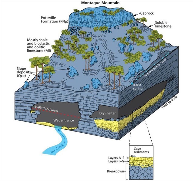 Between 9,000 and 11,000 years ago, the roof of a cavern collapsed beneath the northeastern flank of Montague Mountain, forming a sinkhole that redirected the flow of Dry Creek and exposed the entrance to Russell Cave. Subsequent ceiling collapses and sediment accumulation created a dry shelter perched 24 feet above the Dry Creek channel. The main entrance to Russell Cave, divided into a "dry" and a "wet" entrance by a large rock pillar, formed from these collapses and sediment deposits. During past archaeological digs, the cave sediments were also studied and labeled as layers A through G (with A being the uppermost layer, and G at the bottom), which sit atop a breakdown layer. Layers G and F, deposited by occasional flooding, showed crossbedding indicative of flowing water and contained evidence of human activity such as charcoal pellets and mussel shells from the Tennessee River. Inhabitants leveled off the upper surface of layer F, and subsequent sediments show no signs of flooding. Layer E, horizontally bedded with several fire pit layers, burned limestone, mussel shells, and bone fragments, shows no evidence of water-related deposition and is similar to the adjacent limestone with abundant oolite fragments. Layer D, was deposited atop layer E, contains abundant clay and other materials possibly spread by cave inhabitants. The uppermost layers consist mainly of material derived from the cave walls, mixed with charcoal and shells.
