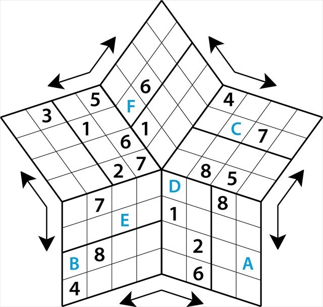 K luštění: do hvězdy doplňte čísla od 1 do 8 tak, aby se žádné číslo neopakovalo ani v tučně vyznačeném obdélníku, "řádku", ani "sloupci". "Sloupce" a "řádky" jsou vyznačeny šipkami na okraji hvězdy.