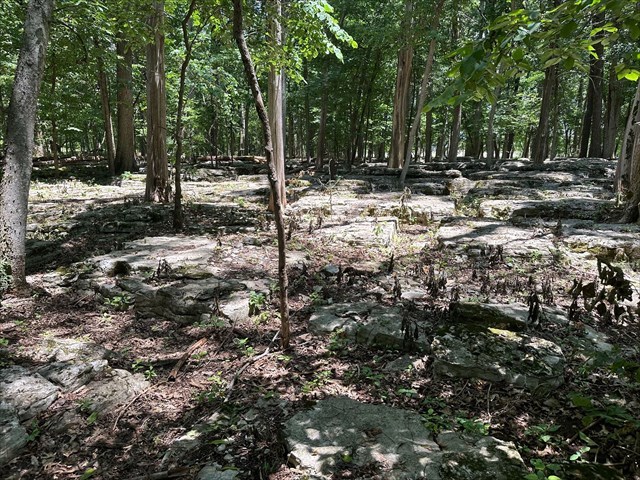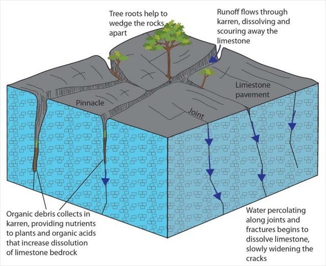 The Slaughter Pen is actually a unique geologic feature known as karren (or 'cutters'). Karren are channels or grooves etched into the surface of exposed limestone bedrock, formed by the slow dissolution of the rock. At this site, karren have developed along broad, weathered fractures in the limestone known as joints. These joints, which are naturally occurring cracks in the bedrock, allow water to penetrate and gradually dissolve the limestone along these lines, widening the fractures over time. As water flows through these joints, it carries organic material that accumulates and fosters soil development within the fractures. The soil that forms in these joints tends to be much deeper than in other areas of the karst landscape. Because of this richer soil, trees and other vegetation are more likely to take root along the joint patterns. The roots of these plants contribute to the mechanical breakdown of the rock, further expanding the karren. Additionally, microbes in the soil produce carbon dioxide, which combines with water to create a weak acidic solution that accelerates the limestone's dissolution. The areas between these karren are marked by limestone pinnacles, which are remnants of bedrock that have resisted erosion.