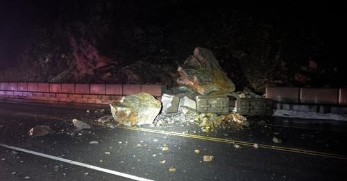 This is an active slide! The last major slide at this location prior to this EarthCache being published was on 2-12-2024. It brought huge boulders crashing down through the concrete barriers and resulted in the road being shut down temporarily while the debri was cleared.