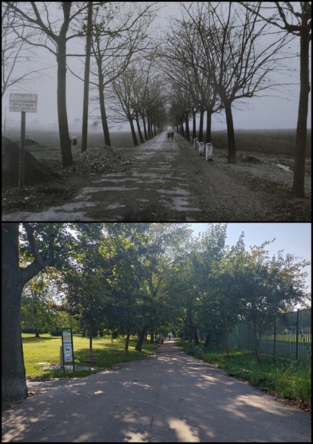 Na obrázku výše je fotografie z 19. prosince roku 1942 a níže pro srovnání fotografie z 28. srpna roku 2024