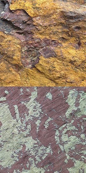 Iron oxides present in rock can be altered depending on the conditions. They can be reduced, oxidized or hydrated, changing the color of the rock. In the Bévinais quarry, in addition to the wine-red color, an ochre color can also be observed. The iron(III) oxides Fe2O3 contained in the rock are hydrated in contact with air and water, to form rust.