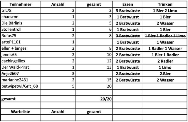 erbitten wir eine Information. Pro Person (Erwachsene UND Kinder) kann in der "Will attend"-Nachricht mitgeteilt werden, ob man 1 Bratwurst und/oder ein Getränk (Bier, auch alkoholfrei sowie Limo - hier ggf. mitteilen welche) haben möchte. Da dies eine gewisse Planung voraussetzt, bitten wir diesbezüglich um zeitnahe Mitteilung, ggf. auch direkt an uns persönlich: Nachricht an den Owner.