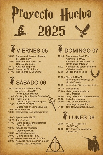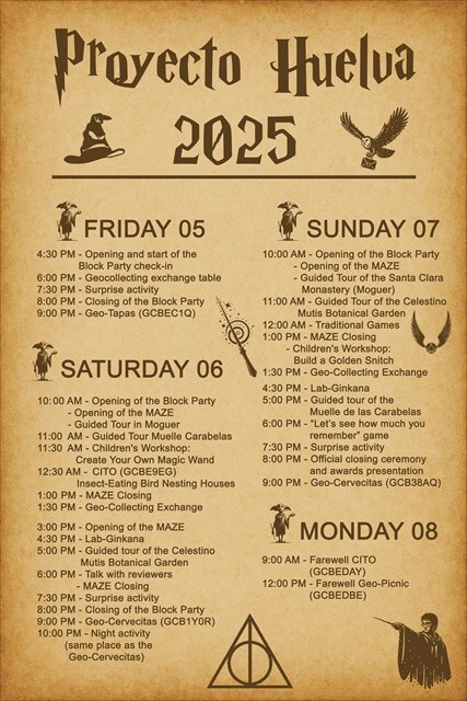 En este breve texto no podemos explicarte todo lo que es Huelva, por ello te invitamos a que lo descubras tú mism@. Nosotros te proporcionamos una ayuda en forma de variadas cajitas escondidas en lugares increíbles; el resto lo pones tú. Queremos ver Huelva llena de Geocachers, y por esto estamos preparando un fin de semana de vértigo para los días 5 al 8 de Diciembre de 2025 para celebrar el 25 aniversario de Geocaching es este BLOCK PARTY.