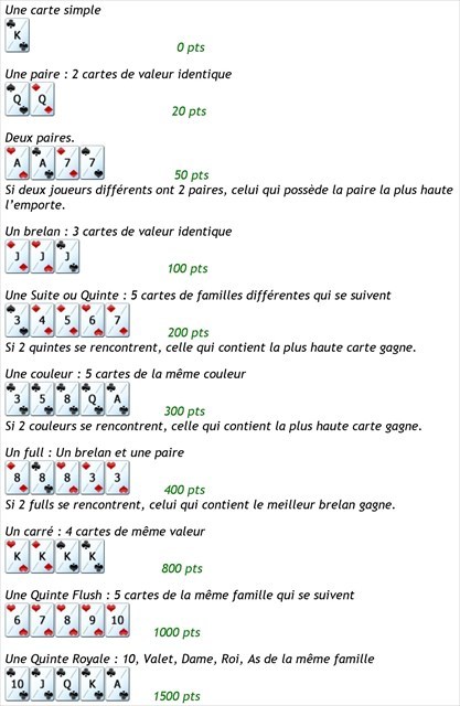 Entre Bouc Bel Air, le cimetière militaire de Luynes et Aix les 3 pigeons se trouve un endroit étrange, un quartier appelé les revenants. Régulièrement, les promeneurs y font souvent d'étranges et effroyables rencontres dans les bois. D'ailleurs vous trouverez dans les images jointes à la Cache - 01 une planche décrivant quelques-uns des revenants et autres personnages qui pourrait vous être utile. Il est grand temps qu'un groupe de courageux aventuriers tentent de percer les mystères entourant cet endroit. Durant les longues journées d'été, quand les revenants ne peuvent pas promener dans les bois, il faut bien qu'ils s'occupent avec quelques jeux. Alors jouons avec eux. Jack le Moissonneur, le fermier maléfique lui, il aime bien jouer au poker avec quelques amis en attendant la nuit. Voici 4 mains de 5 cartes.