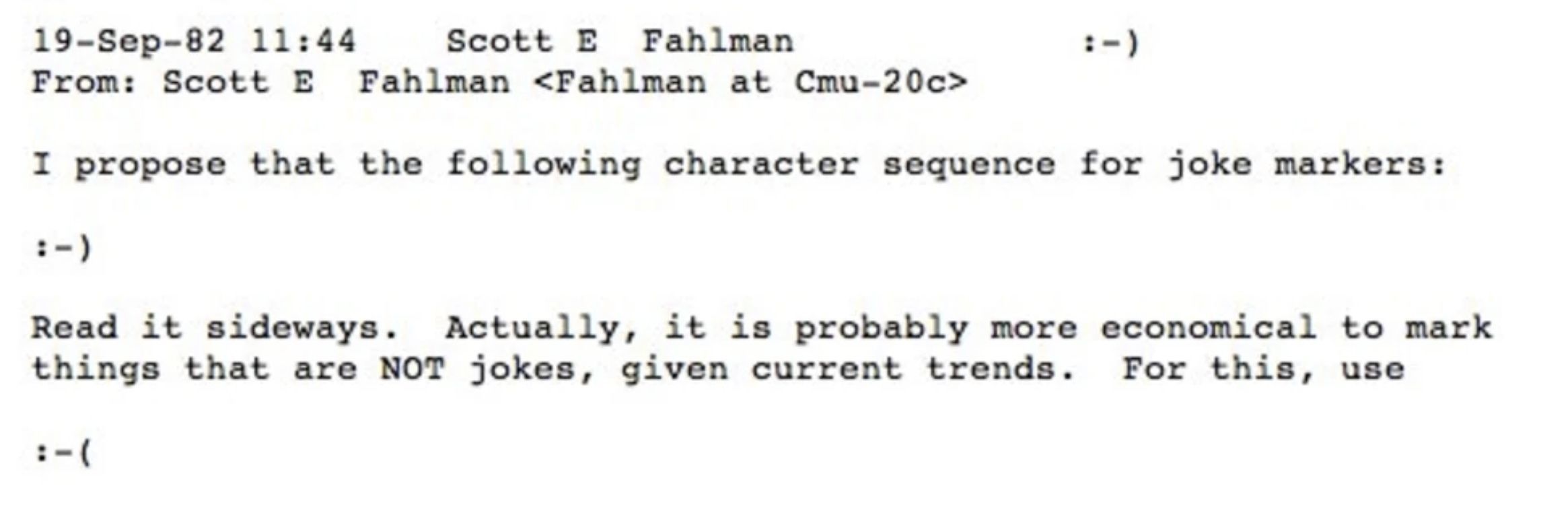 Am 19. September 1982 heftet der IT-Professor Scott Fahlman eine Nachricht an das elektronische schwarze Brett der Carnegie Mellon Universität und das Emoticon ist entstanden.