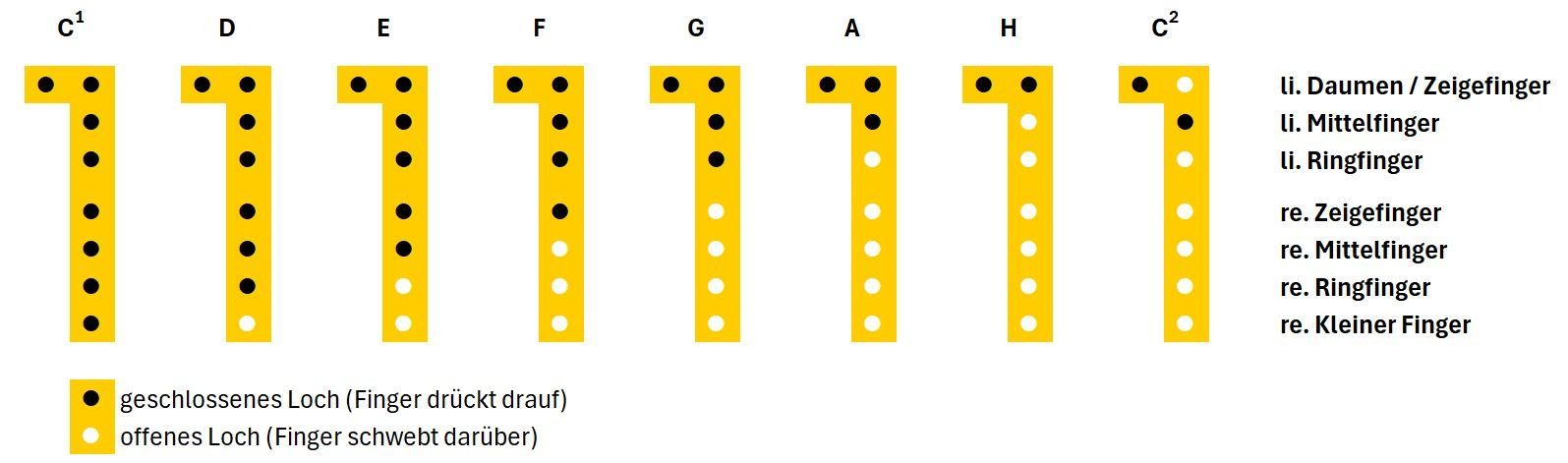 Damit auch die unter uns, die dieses tolle Instrument nicht in der Schule lernen durften, ein wenig vertrauter damit werden, wollen wir hier einen kleinen Kurs anbieten. Das wichtigste sind natürlich die Griffe, um die Noten in der ersten Oktave greifen zu können. Dabei beschränken wir uns für den Anfang auf die vorzeichenlosen Noten von C1 bis C2. Eine sehr schöne Übersicht, mit gibt es zum Beispiel hier.