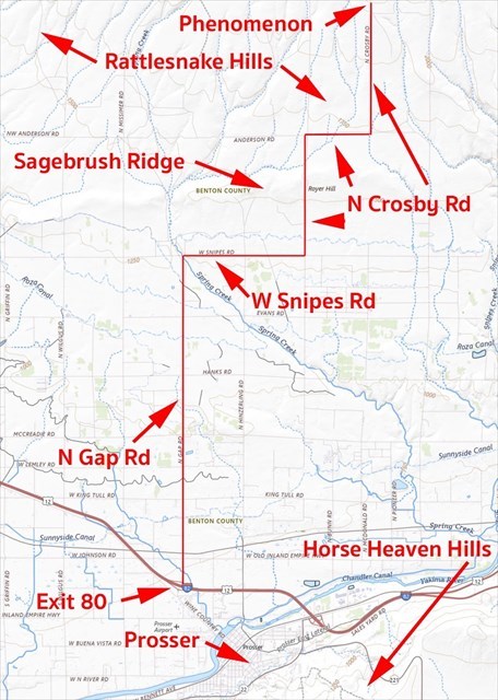 Topographical map of Rattlesnake Hills, Benton County, Washington. Courtesy of the U.S. Geological Survey, Department of the Interior/USGS (Text added).