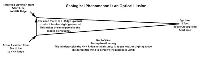 Data Collection: By walking from the start line to the green utility post (#12000058, near the silo), some 520 feet to the south on Crosby Road with a GPS altimeter, the road drops 36 feet in total. The road actually goes downhill over the total distance even though it feels as if a person is walking uphill.