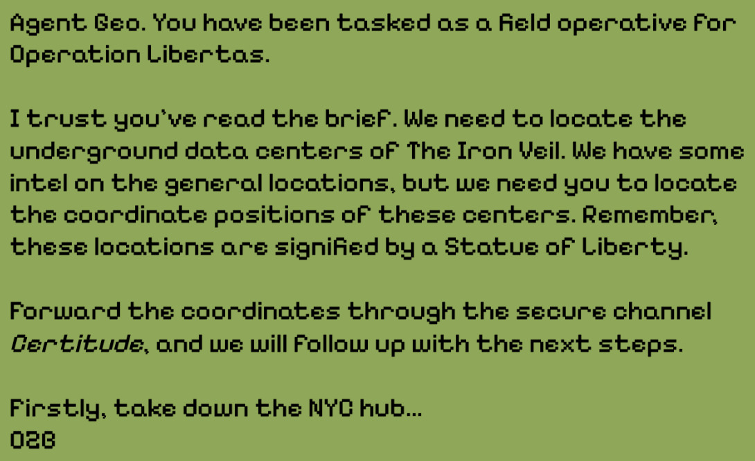 Your mission is to locate these statues, which mark the entrances to the underground bunkers. Once on site, we will inform you how to disrupt their operations. Due to their dangerous control over information, we must communicate through our secure, encrypted channel Certitude.
