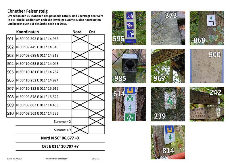 Ordnet an den 10 Stationen auf eurem Weg den jeweiligen Zahlenwert des Fotos in die Tabelle ein und bildet am Ende die Summen und addiert diese zu den Koordinaten, um die Dose zu finden.