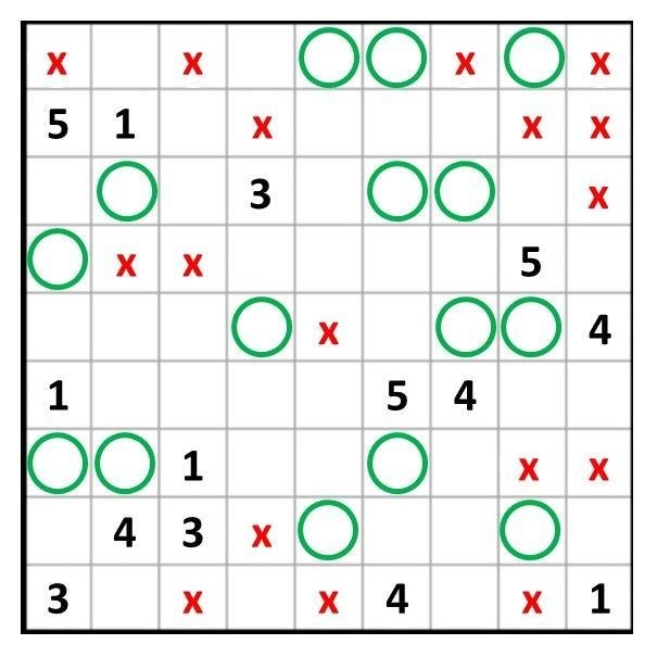 - Die Felder mit einem roten x dürfen keine Zahl enthalten, müssen also leer bleiben.