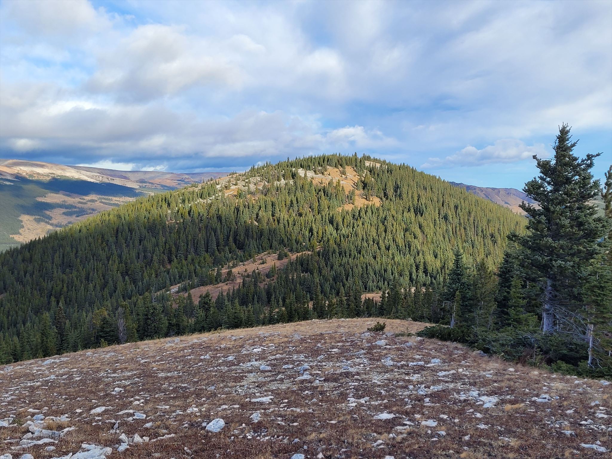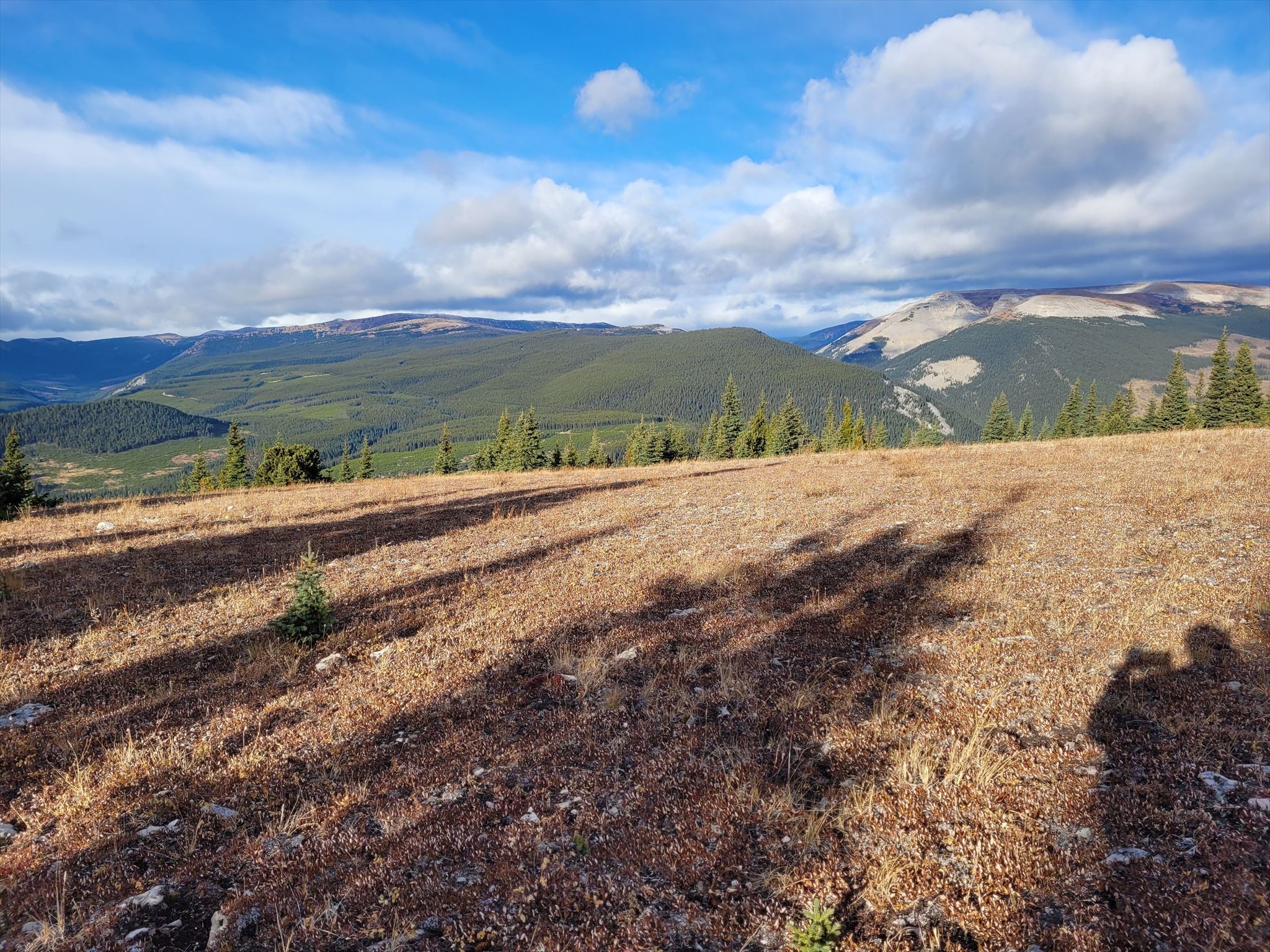 I followed along the ridge heading north from the Windy Peak Hills West Summit. It was a little bushwhacky in spots, but definitely not bad. Once atop the NW summit, a large clearing boasts great views to the west. Slightly further east, an open area close to the cache site provides views east to the foothills and beyond to the prairies. Although I didn't do it, I'm sure you could follow the ridge back west towards Hwy 40, making for a nice short hiking loop. This is a great option for shoulder-season hiking - just keep in mind there's a seasonal road closure that restricts vehicle traffic in the area.