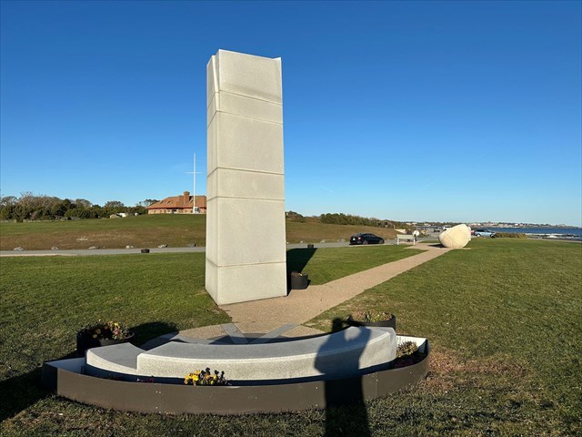 The original monument at this location was constructed from sandstone, but it quickly deteriorated under the harsh ocean winds. The current monument is made from North Jay White Granite, which was quarried in Maine. This granite is composed of several minerals, including potassium feldspar (a pinkish or white mineral with a glassy look), clear quartz (a colorless, crystalline mineral), plagioclase feldspar (a white to pale mineral with a dull shine), black mica (a shiny, black mineral that forms in thin sheets), and white mica (similar to black mica but white or silvery). It may also contain other minerals such as garnet (red or pink crystals), magnetite (black, metallic looking mineral), and apatite (small, glassy crystals). North Jay White Granite has a bright appearance, which comes from the clarity of its quartz, which lacks the gray or brown tint seen in smoky quartz, as well as the reflective whiteness of its feldspar. North Jay White Granite was formed millions of years ago deep beneath the Earth's surface when molten rock, or magma, cooled and solidified slowly. Geologically, it is noted for its low absorption rate of 0.27%, high compressive strength of 27,700 psi, and flexural strength of 2,020 psi. These properties make it a popular building material.