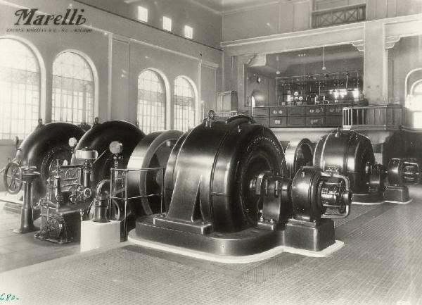Sala macchine centrale Funghera: alternatori Ercole Marelli da 200 KVA accoppiati a Turbine Francis della ditta Riva. Foto datata circa 1930 archivio Ercole Marelli