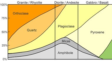 鉱物学:石英、アルカリ長石、斜長石を主成分とし、角閃石や黒雲母を含む。