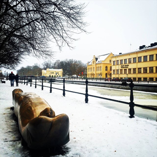 At the coordinates by Fyrisån, you can experience one of Uppsala's most appreciated works of art, I dina händer - Jona (In your hands - Jona). The sculpture is always warm and a popular place for frozen visitors. The artwork is created by Kajsa Mattas and was installed in 2004.