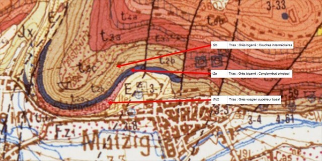 It is overlooked by an imposing spur of rock formed in the Triassic period, sandstone sedimentary rocks ranging from pink Vosges sandstone (t1b2) to Voltzia sandstone (t2b) via a particular conglomeratic formation called Conglomérat Principal (t2a).