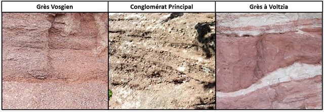 - Le Grès Vosgien : roche de couleur rose aux grains grossiers (taille millimétrique), il s'agit d'une arénite grossière de couleur rose, à faible teneur en argiles et au litage peu marqué.