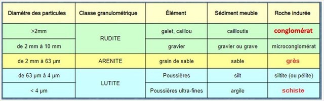 Une fois cimentés par diagenèse, ces dépôts donnent différentes roches dépendant de la taille de ces sédiments (classification granulométrique).