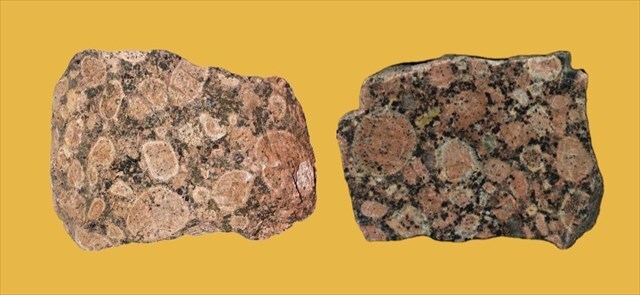 The most distinctive feature of rapakivi pyterlite granite is its coarse texture with large ovoid potassium feldspar crystals (often reddish or pink in color) surrounded by rings of white or gray plagioclase mantle. Feldspar crystals are usually embedded in a groundmass of quartz, biotite, and hornblende.