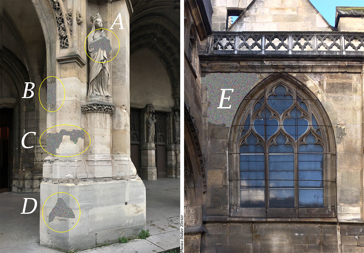 The phenomenon of stone degradation is mainly governed by climatic conditions (rain, cold, sun, wind, atmospheric pollution, ...), by the morphology of the building (sculptures, facades, cornices, balconies, window frames, ...) and exposure (North, East, South, West faces with respect to meteorological phenomena, lower parts with respect to the influence of the ground), but also by the nature of the stone itself (mineralogical composition, porosity structure.