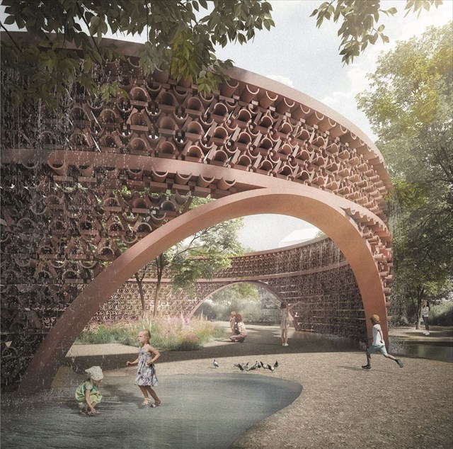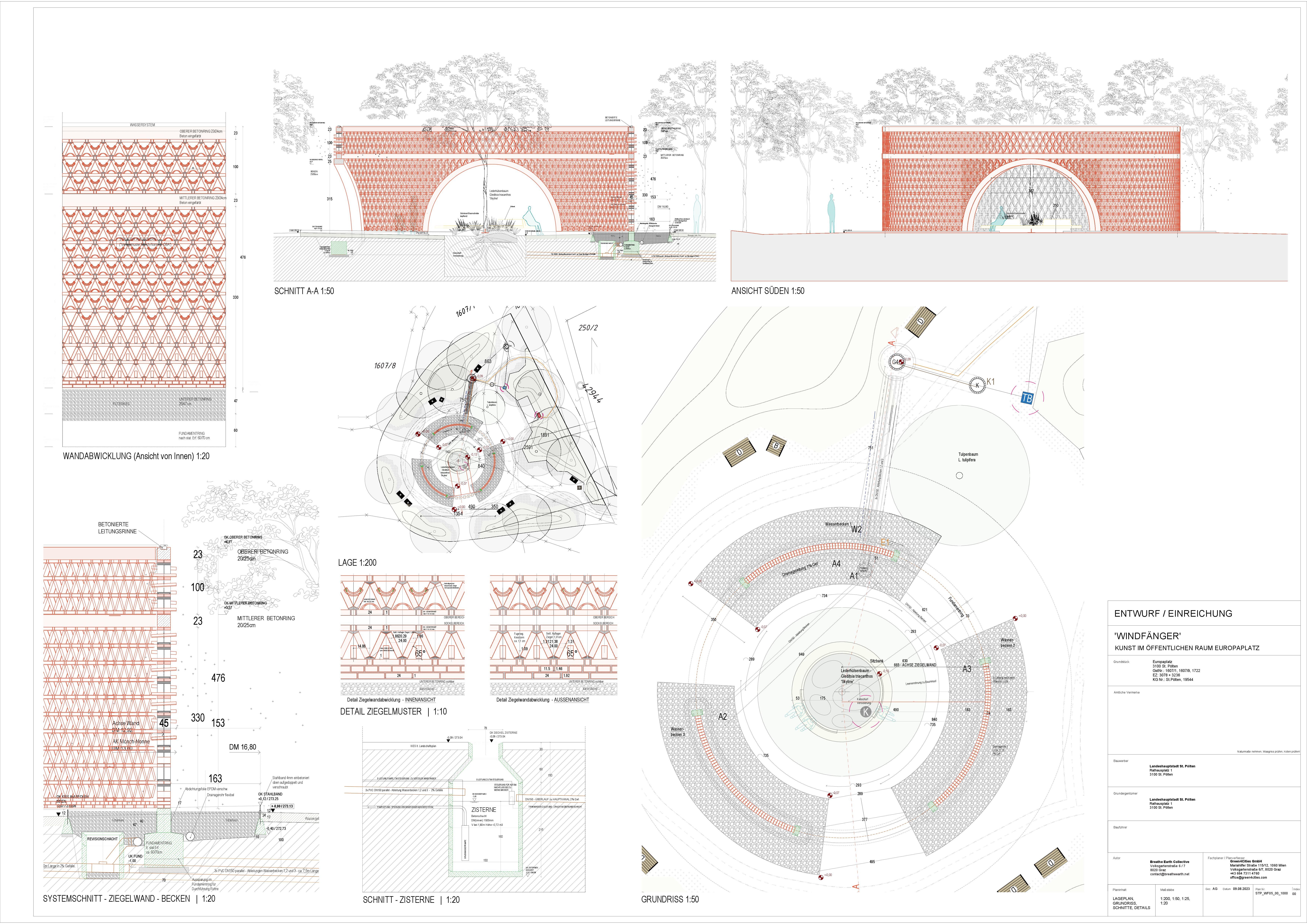 Der Windfänger des Kollektivs „Breathe Earth Collective“ ist eine großflächige Brunnenskulptur in Form einer oben geöffneten Rotunde mit drei Torbögen. Bautechnisch inspiriert von der arabischen Maschrabiyya, den vernakulären ägyptischen Kühltechniken sowie auch in den Ostalpen bekannten traditionellen Ziegelgitterstrukturen, wird die mit sogenannten Mönch- und Nonne-Ziegelformen ergänzte Struktur an drei Stellen mit Wasserkreisläufen von oben bewässert. Das über Vor- und Rücksprünge in der Wand herab geleitete Wasser erzeugt ein Wasserspiel und wird im darunterliegenden Wasserbecken aufgefangen und rückgeführt. Durch das Bewässerungssystem können die Ziegel heiße durchströmende Luft aus der Umgebung abkühlen, zugleich werden Verkehrslärm und Feinstaub reduziert.