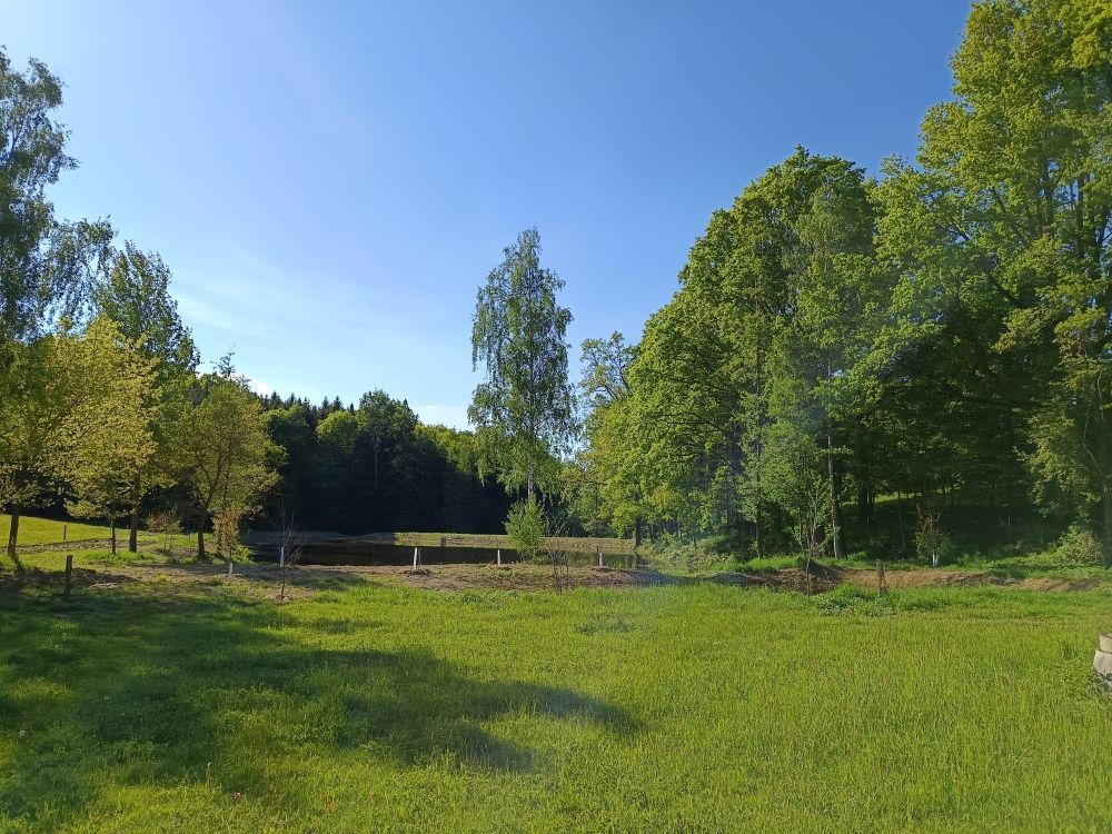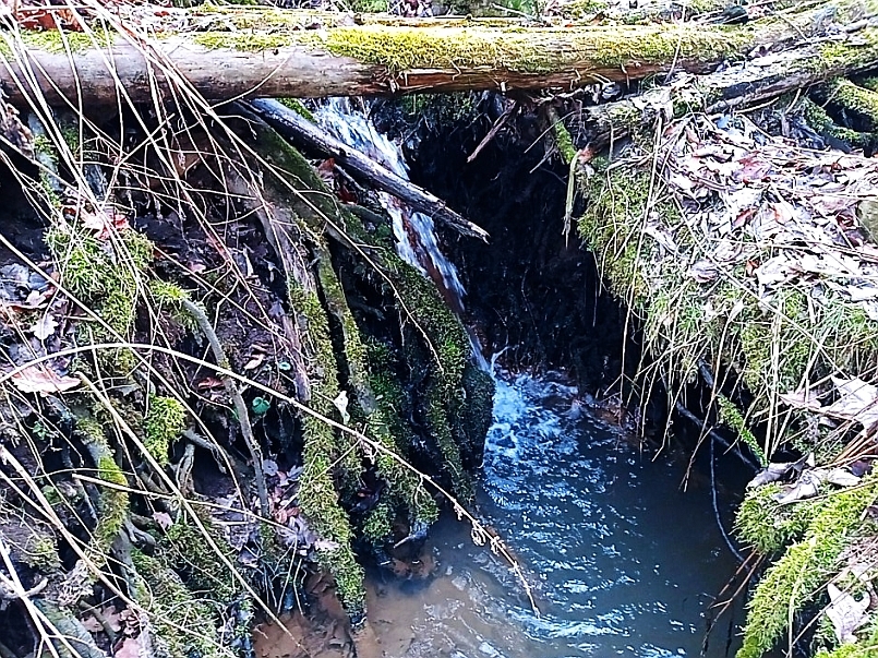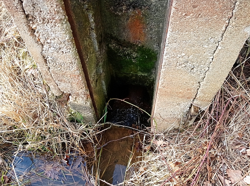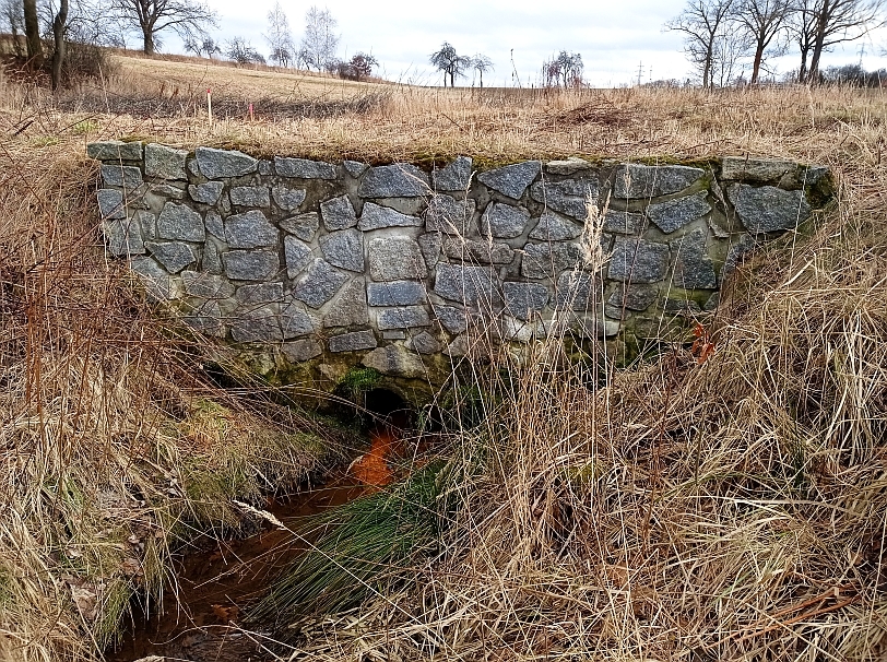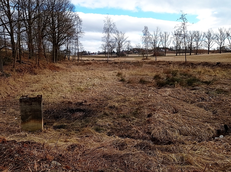Tak tohle jsou dnes už jen historické fotografie. Potůček se tu klikatil po dně bývalého rybníka ke stavidlu v dezolátním stavu a pod hrází vtékal do svého koryta. Toto místo schované pod starým pařezem bylo rozpoznatelné po sluchu, jak si hezky zurčel.-) Podaří se vám nalézt, jak to tu vypadá dnes?