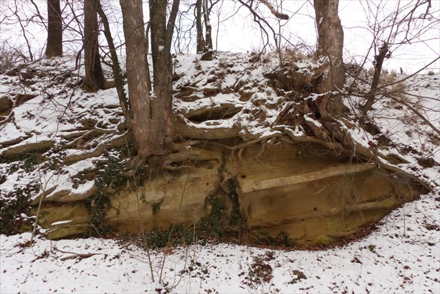 Na úvodních souřadnicích v bezprostřední blízkosti parkoviště u kostela Nanebevzetí Panny Marie se totiž nachází malý skalní výchoz s další reprezentativní ukázkou zdejších pískovců. K tomuto odkryvu můžete přistoupit a z bezprostřední blízkosti obdivovat různě erodované jednotlivé vrstvy a sáhnout si na ně. Na tomto malém odkryvu jsou dobře pozorovatelné různě mocné a různě odolné vrstvy zdejšího pískovce i pestrá škála jeho barev.