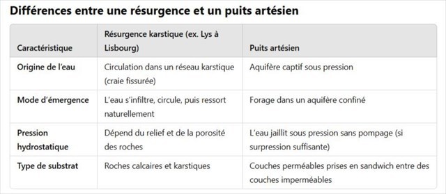 La résurgence de la Lys se distingue d’un puits artésien par son mode d’alimentation et d’écoulement. Un puits artésien capte l’eau d’un aquifère confiné, emprisonnée sous pression entre deux couches imperméables, ce qui permet à l’eau de remonter spontanément lorsqu’un forage atteint la nappe. À Lisbourg, l’eau s’infiltre dans les roches calcaires perméables, circule librement dans un réseau karstique fissuré, puis ressort naturellement sous l’effet de la gravité. Contrairement à un puits artésien, où l’écoulement peut être continu si l’aquifère est bien alimenté, la résurgence de la Lys voit son débit varier en fonction des précipitations et du niveau de saturation des aquifères locaux.
