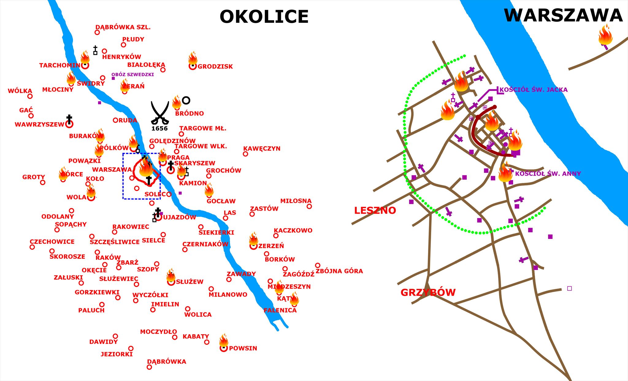 Swedish troops reached outskirts of Praga on July 28, 1656, and they set up a camp between villages Świdry and Żerań, and Jan Kazimierz entrenched his troops at the fieldworks in front of Praga. At 5pm began the three-day-battle, run in the area between Bródno, Białołęka, Skaryszew and Gocław. On the first day the Swedish army attacked Polish fieldworks, but the assaults failed. The counterattack of Jan Kazimierz's troops collapsed after the Lithuanian troops have been spotted going too long through the Skurcza river. The next day Swedes started an artillery attack, while carrying out a flanking maneuver at the same time. The infantry attack was repulsed at the fieldworks, and the Swedish maneuver was noticed at the very last moment to carry out a reconnaissance attack towards Bródno. Unresolved battle encouraged Karl X Gustav to strenghten the flanks, but Polish troops did move to more favorable positions in time. An attack was launched first by Polish army, it was successful enough for Jakub Kowalewski to approach King Karl X Gustav, being very close to kill him. However, the assault was repulsed, but the village Bródno was burned, and all the people were killed. On the third day a general attack was carried out by Swedish troops – not only from Żerań and Bródno, but also from Okuniew. Under the pressure of infantry and artillery Polish troops left the fieldworks, and when the King Jan Kazimierz noticed the threat, he ordered to defend Praga, Grochów and Gocław, and then he ordered to withdraw the troops to the left bank of the river. Warsaw surrendered without a fight, and Swedish troops made a slaughter on the people in Praga. Villages Gocław, Grodzisk, Kamion, Kąty, Tarchomin and Żerań were destroyed, as well as villages Buraków, Górce, Młociny, Powązki or Powsin on the left bank. View of Warsaw during the battle was drawn by the Swedish cartographer Erik Dahlbergh. Swedes took the city, but in September they decided to evacuate – war loot with the most valuable architectural parts of Warsaw buildings were transported by ships towards Gdańsk, but they were mostly overloaded and sank next to Golędzinów. However the people tried to bring them out, most of the treasures remained in the sands of Vistula for centuries. It is known that only several guns and sculptures were drawn out of the river. In 1657 totally demolished Warsaw stood once again on the warfront – the city was shortly occupied by the troops of György Rákóczi from Transylvania, allied with the Swedes. That time the Krakowskie Przedmieście Street was destoyed once again, together with the St. Anna's Church. Although the "Swedish Deluge" lasted until 1660, the was no more fights in the vicinity of Warsaw. All preserved fieldworks around Warsaw were later known as "Swedish Mountains" ("Góry Szwedzkie"). Also in 1657 started the reconstruction of several destroyed churches, like St. Hyacinth Church or St. Catherine Church in Służew. The bishop Wojciech Grabowski authorized the Służew parish priest to make a reconciliation of the desecrated church.