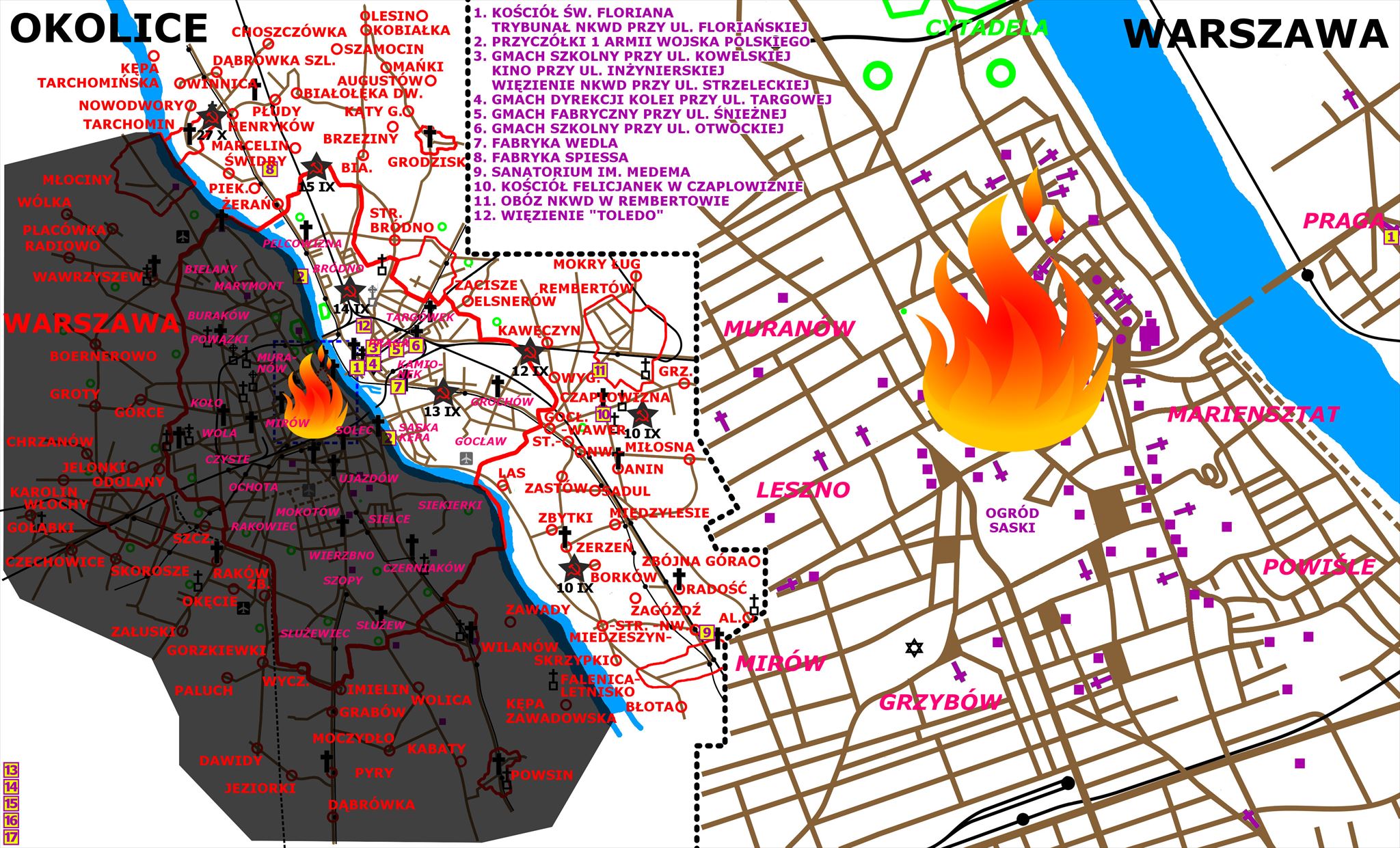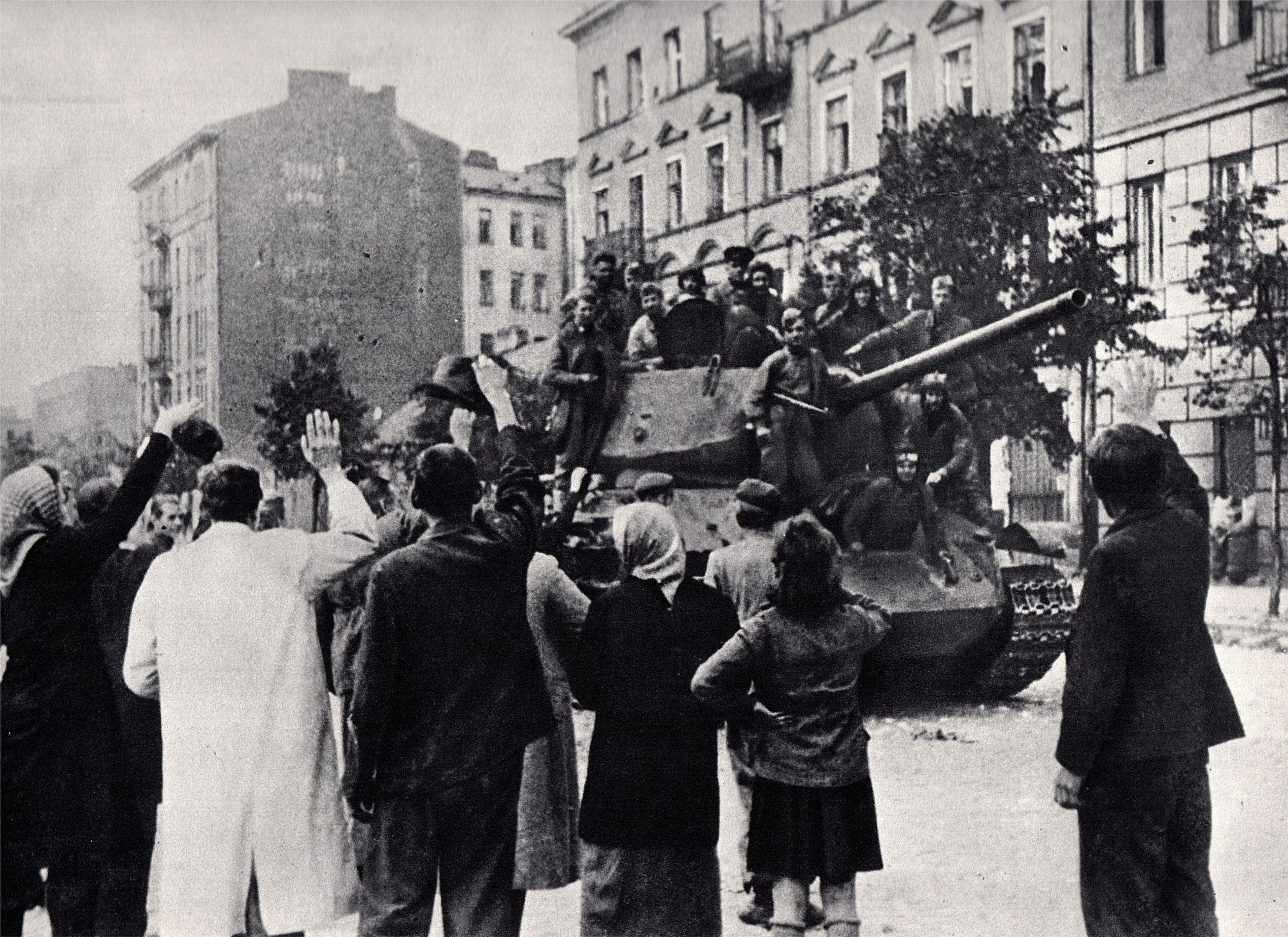 The Red Army together with the 1st Polish Army reached the foregrounds of Warsaw at the beginning of September 1944. In the last days of governing Praga Germans managed to take away most of the machines from the factories, blow up the bridges and also the Church of St. Florian the Martyr and St. Michael the Archangel. From 10 September Polish and Soviet troops gradually reached new towns – Falenica, Radość, Międzylesie, Zerzeń, Wawer, Czaplowizna and Kawęczyn – until 15 September, when they captured Praga completely. A few more weeks took the Russians to capture other villages to the north from Praga, until on 27 October they took control over the area of Płudy and Henryków. In the meantime the Polish Army made limited attempts to help the participants of the Warsaw Uprising, but the bridgeheads acquired in Marymont and Czerniaków were destroyed by German troops, so the decision was made to stop the attack. Instead, the restoration of normal life began in Praga. In September and October the first field hospital was opened in the school building at Kowelska St., the municipal authorities were located in the building at Targowa St., the Praga Radio Station and the delegates of the State National Council were operating in the factory building at Śnieżna St., municipal enterprises worked in the school building at Otwocka St. and the first cinema and “Powszechny” theater were opened at Inżynierska Street. The production in the Wedel Factory in Kamionek was restored, the first product were 80 kilograms of caramel, and in the Spiess’ Factory in Tarchomin, who released five tons of ointment against scabies. In Medem’s Sanatory in Miedzeszyn a center for orphaned Polish children was opened, supported by UNRRA gifts. Offices, schools, shops and markets – the biggest one at Stalowa St. – were opened, and more than 150 thousands of inhabitants of Praga were allowed to return relatively safely to their all-day classes. However, the people still had to avoid the German fire from behind the Vistula – for this reason huge coal heaps at the Eastern Railway Station burnt on 20 November, and the firefighting was hampered by a shortage of equipment, and on 28 November the tower of the Church of Our Lady Queen of Poland in Czaplowizna was blown up, because it was an excellent landmark for Germans, visible from the left bank of the river. Apart from the Polish socialist authorities, another units were also installed by Russians, in particular the NKVD officers. In the post-German stalag camp in Rembertów they put a camp for „enemies of the people”, where many captured members of the Home Army were imprisoned – they were recognised as enemies of socialism – who were also interrogated and imprisoned in specially adapted rooms at Strzelecka St. and in the barracks at 11 Listopada St., in the so-called „Toledo” prison, and the trials were made in the NKVD war court in the former home of the veterans at Floriańska Street. Russians were getting prepared for the further offensive, and the time came in January – the Red Army and the Polish Army crossed the Vistula on 17 January 1945.