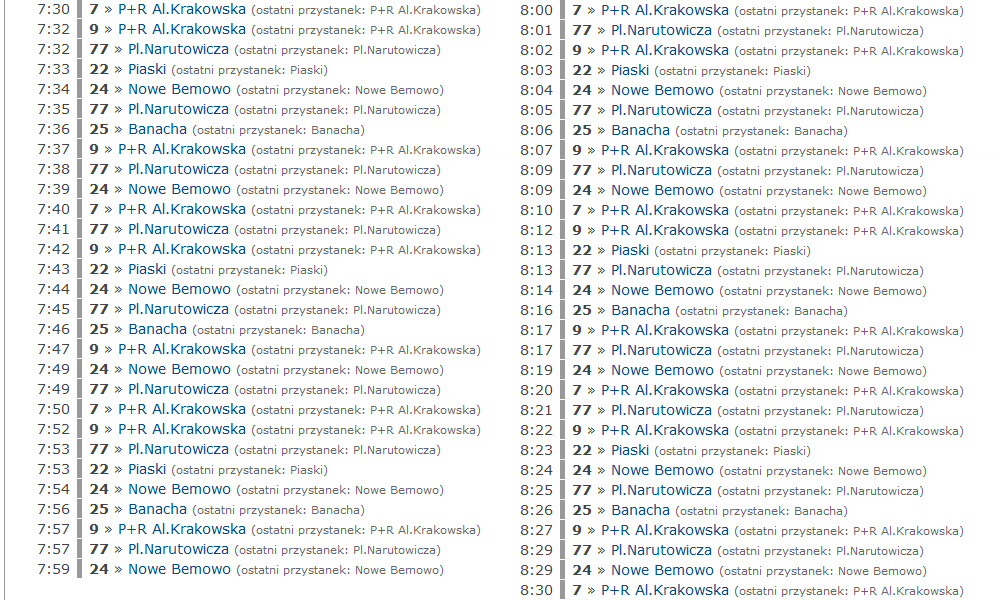 A] Najpierw na wysokości ul. Wał Miedzeszyński pojawił się biały dym uchodzący spod asfaltu, który niedługo potem zaczął się zwijać i wybrzuszać, a od spodu dostrzec można było płomienie. Przeprawę natychmiast zamknięto, a wszystkie autobusy i samochody, skierowane awaryjnie na sąsiednie mosty, zablokowały miasto pomimo późnego sobotniego wieczora. Jeden z najruchliwszych mostów w Warszawie został uszkodzony na tyle, że trzeba było go w praktyce zbudować od nowa, a dzięki specjalnemu trybowi udało się to zrobić w zaledwie kilka miesięcy. W tym jednak czasie wszystkie warszawskie mosty korkowały się przy najmniejszym utrudnieniu, a tramwaje przez Most Poniatowskiego kursowały w godzinach szczytu z częstotliwością przekraczającą przepustowość całej trasy – nawet 59 kursów w ciągu godziny, jak na widocznym poniżej zrzucie odjazdów w godzinach od 7:30 do 8:30 z przystanku „Rondo Waszyngtona”. Pożar którego mostu spowodował takie utrudnienia w skali całego miasta?