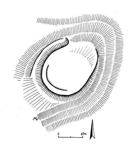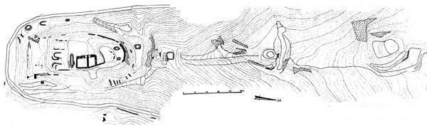 Zbytek stavby ve svahu pod hradem, snad první brány; v popředí propadlina, která je někdy považována za zasypanou studnu