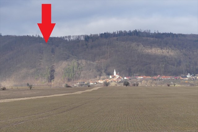 Výhled z Drahotuše na obec Loučku a hrad Helfštýn v pozadí; zde si můžete udělat představu o skutečné vzdálenosti obou hradů