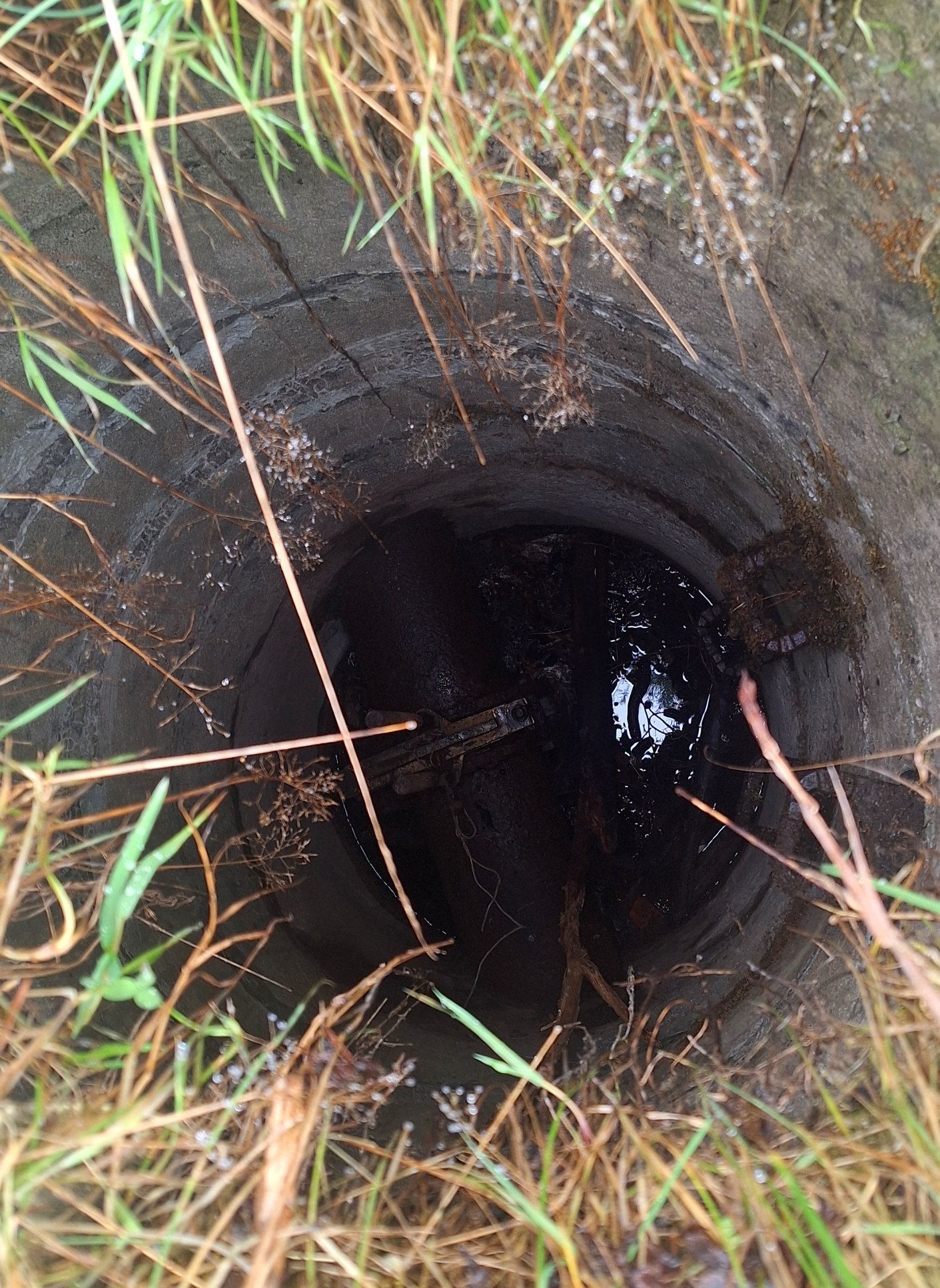 Detail otevřené(!) šachty odtokového kanálu u jižního okraje bazénu.