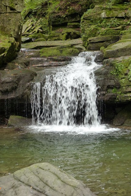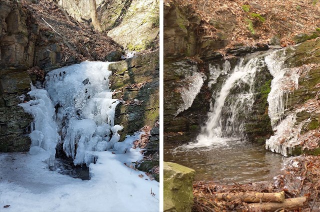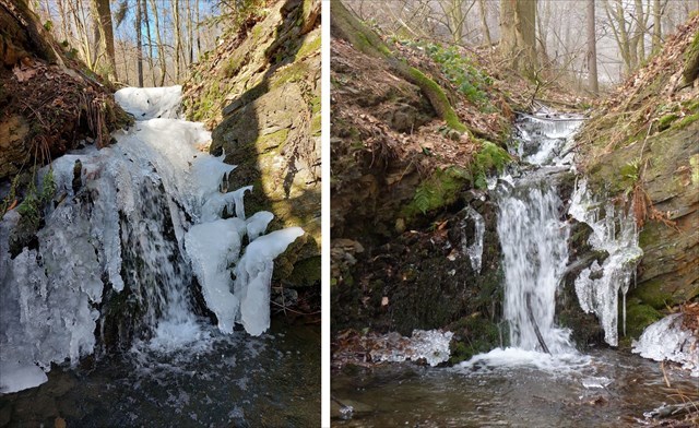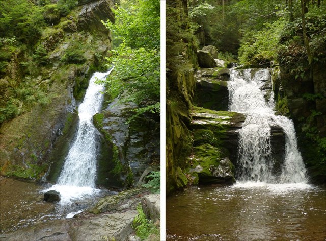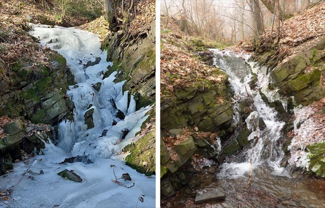 2) Když si stoupnete čelem k prvnímu vodopádu, povšimněte si, že levý břeh koryta je více erodovaný než pravý. Zamyslete se, jaká je asi příčina tohoto rozdílu.