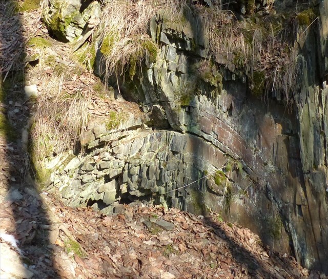 3) Prohlédněte si břidlice tvořící podklad a boční stěny prvního vodopádu a popište jejich barvu a zrnitost – je to drobnozrnná, středně zrnitá či hrubozrnná břidlice?