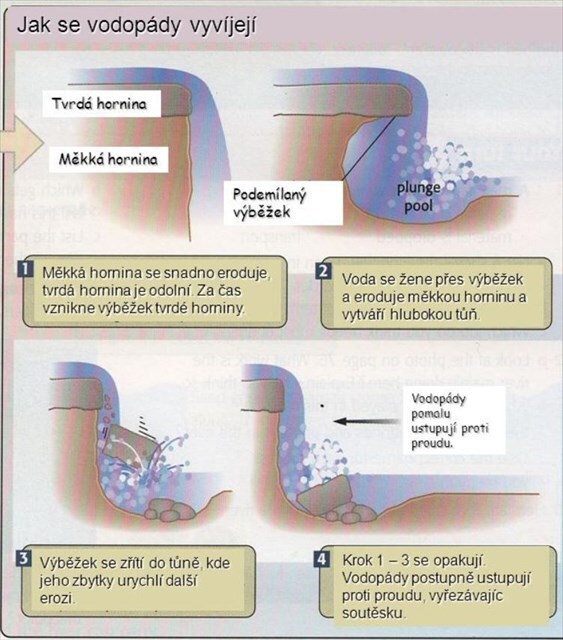 Na těchto třech největších stupních můžeme právě dobře pozorovat projevy zpětné eroze při úpatí vodopádů, kde dopadající proud vyrývá v měkčím podloží hlubokou tůň, a snahu toku vyrovnat postupem proti proudu spád svého koryta.