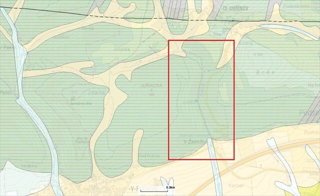 Údolí Žabnického potoka na geologické mapě ČR, zelenou barvou jsou vyznačeny břidlice